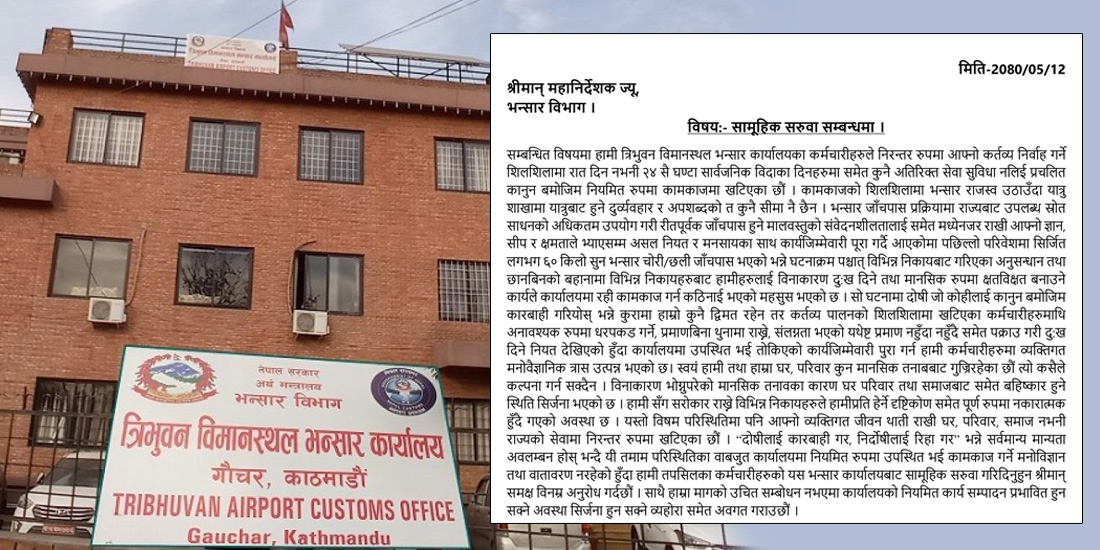 कर्मचारीहरुले निवेदनमा ६० किलो सुन प्रकरणलाई लिएर अनुसन्धान र छानबिनको वहानामा विनाकारण दुःख दिने र मानसिक रुपमा क्षतविक्षत बनाउने काम भएको भनिएको छ । साथै उनिहरुले मागको उचित सम्बोधन नभएमा कार्यालयको नियमित काम समेत प्रभावित हुन सक्ने व्यहोरा समेत अवगत गराएका छन् ।