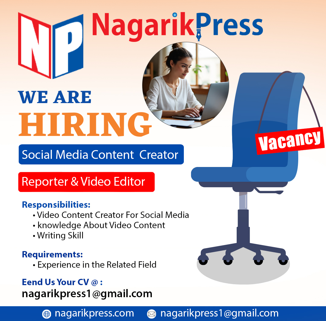 नागरिक ई प्रेस प्रालिद्वारा सञ्चालित www.nagarikpress.com लाई केही जनशक्ति आवश्यकता परेको हुनाले तपाईं कन्टेन्ट क्रिएटरमा दक्ष हुनुहुन्छ भने आवेदन दिन सक्नुहुने छ ।
