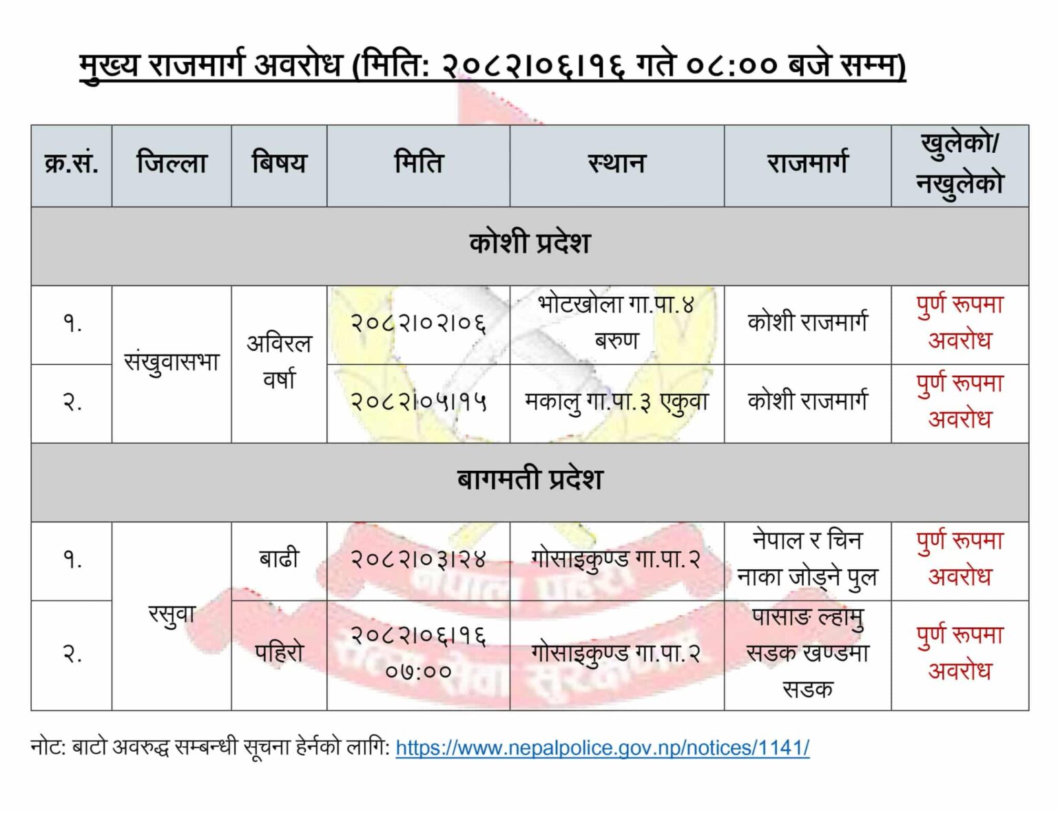 कोशी प्रदेशमा संखुवासभाको भोटखोला गाउँपालिका–४, बरुण क्षेत्रमा जेठ ६ गतेदेखि र मकालु गाउँपालिका–३, एकुवामा भदौ १५ गतेदेखि कोशी राजमार्ग बन्द छ ।