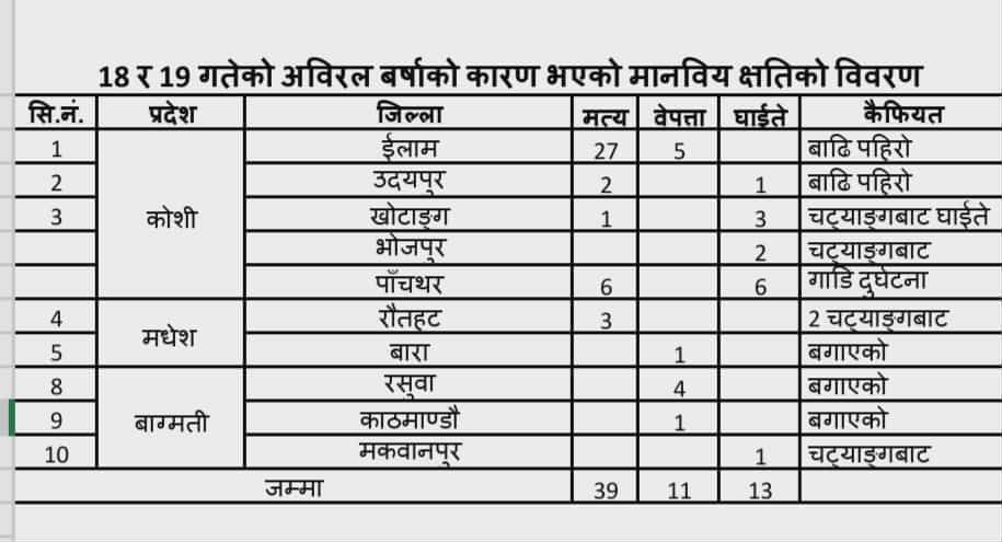 काठमाडौं । शनिबार र आइतबार परेको अविरल वर्षाका कारण अहिलेसम्म ३९ जनाको ज्यान गइसकेको छ ।