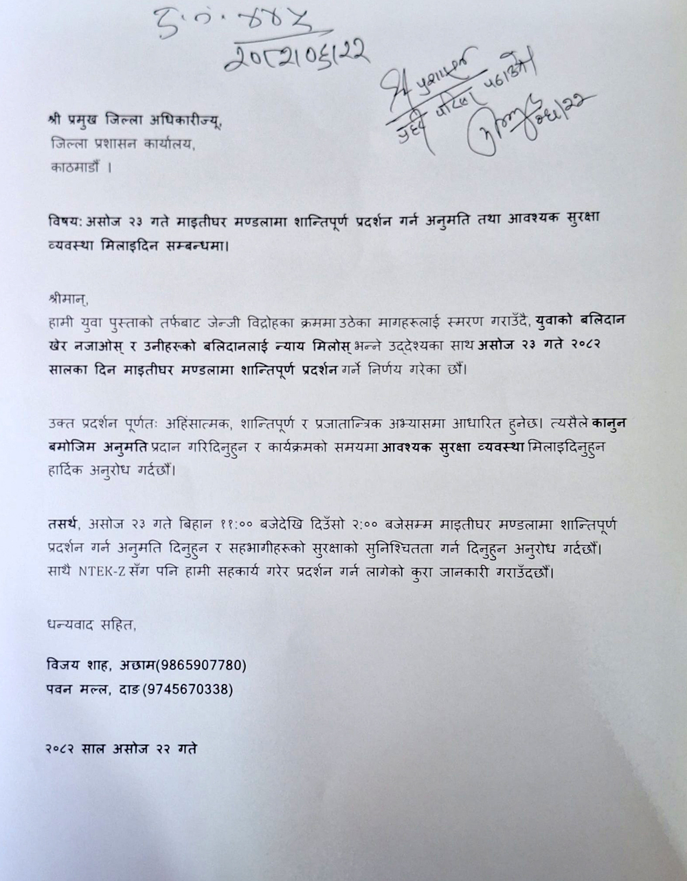शाह र मल्लले हस्ताक्षर गरेको निवेदनमा भनिएको छ- देशमा परिवर्तनका लागि युथद्वारा गरिएको जेन्जी विद्रोहका माग लामो समयदेखि बेवास्ता हुँदै आएकाले ती मागको स्मरण र युवाको बलिदानलाई सम्मान दिलाउने उद्देश्यसाथ जेनजी मुभमेन्टले असोज २३ गते माइतीघर मण्डलामा शान्तिपूर्ण प्रदर्शन गर्ने घोषणा गरेको गरेको छ।