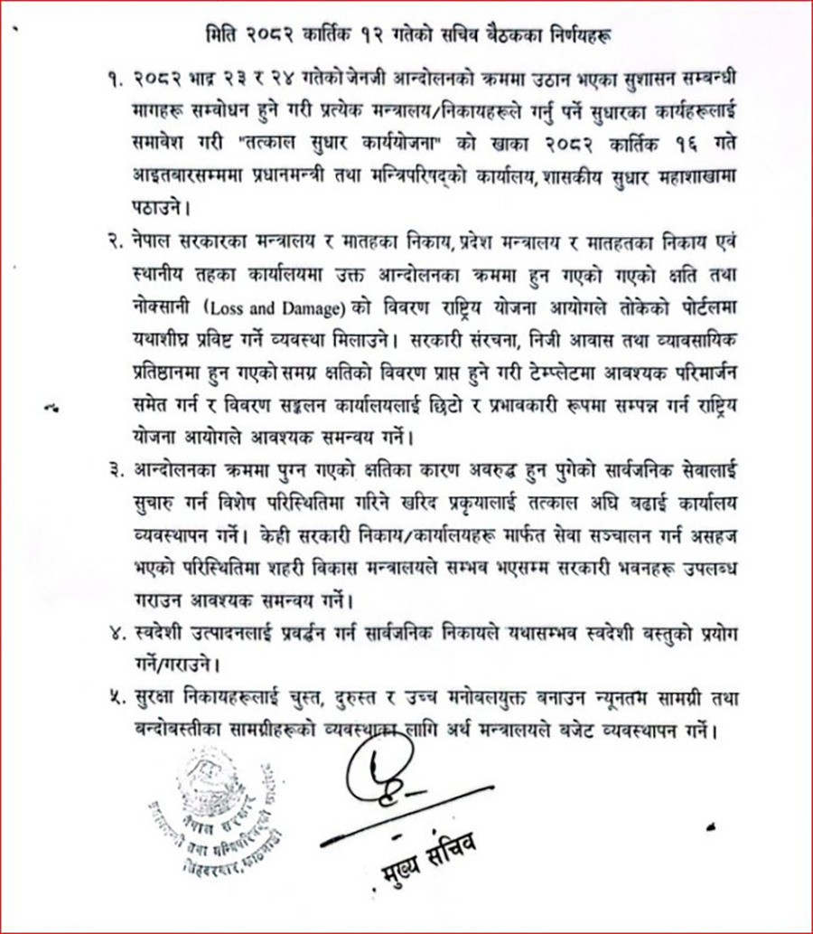 प्रधानमन्त्री कार्यालयले सार्वजनिक गरेको सचिवहरूको कार्तिक १२ गते मंगलबार बसेको बैठकको निर्णयमा २०८२ भाद्र २३ र २४ गते भएको जेनजी आन्दोलनपछि उठान भएका मागहरू सम्बोधन गर्नका लागि आवश्यक सुधारका कार्यहरू समावेश गरी कार्ययोजनाको खाका आगामी कार्तिक १६ गते आइतबारसम्म शासकीय सुधार महाशाखामा पठाउन उल्लेख छ ।