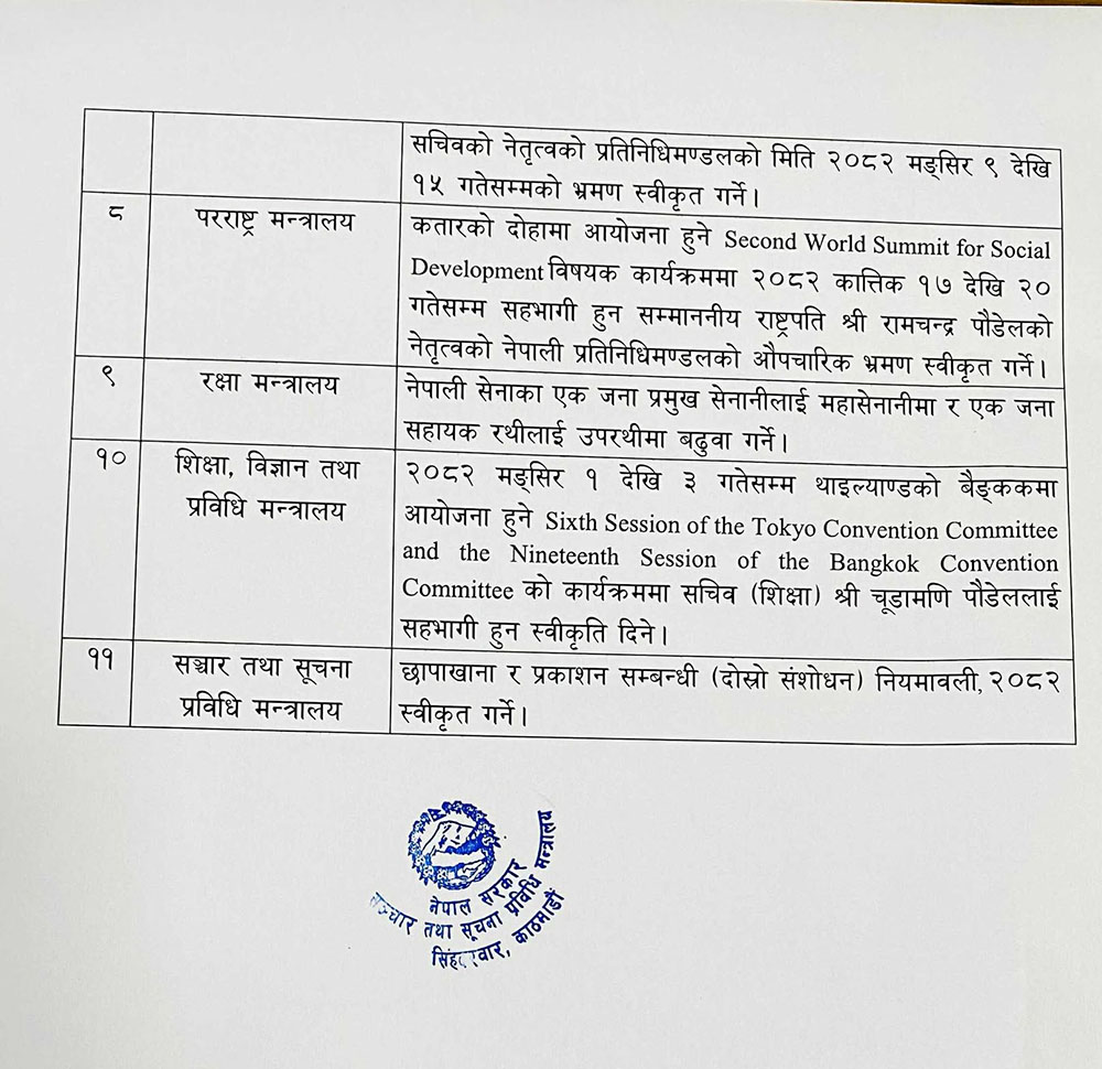 यी हुन् मन्त्रिपरिषद् बैठकका ११ निर्णय : राष्ट्रपति पौडेलको कतार भ्रमण स्वीकृत