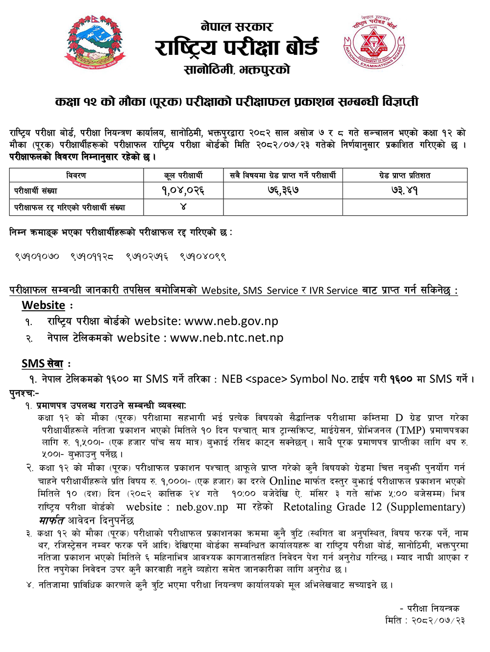 कक्षा १२ को पूरक परीक्षाको नतिजा सार्वजनिक