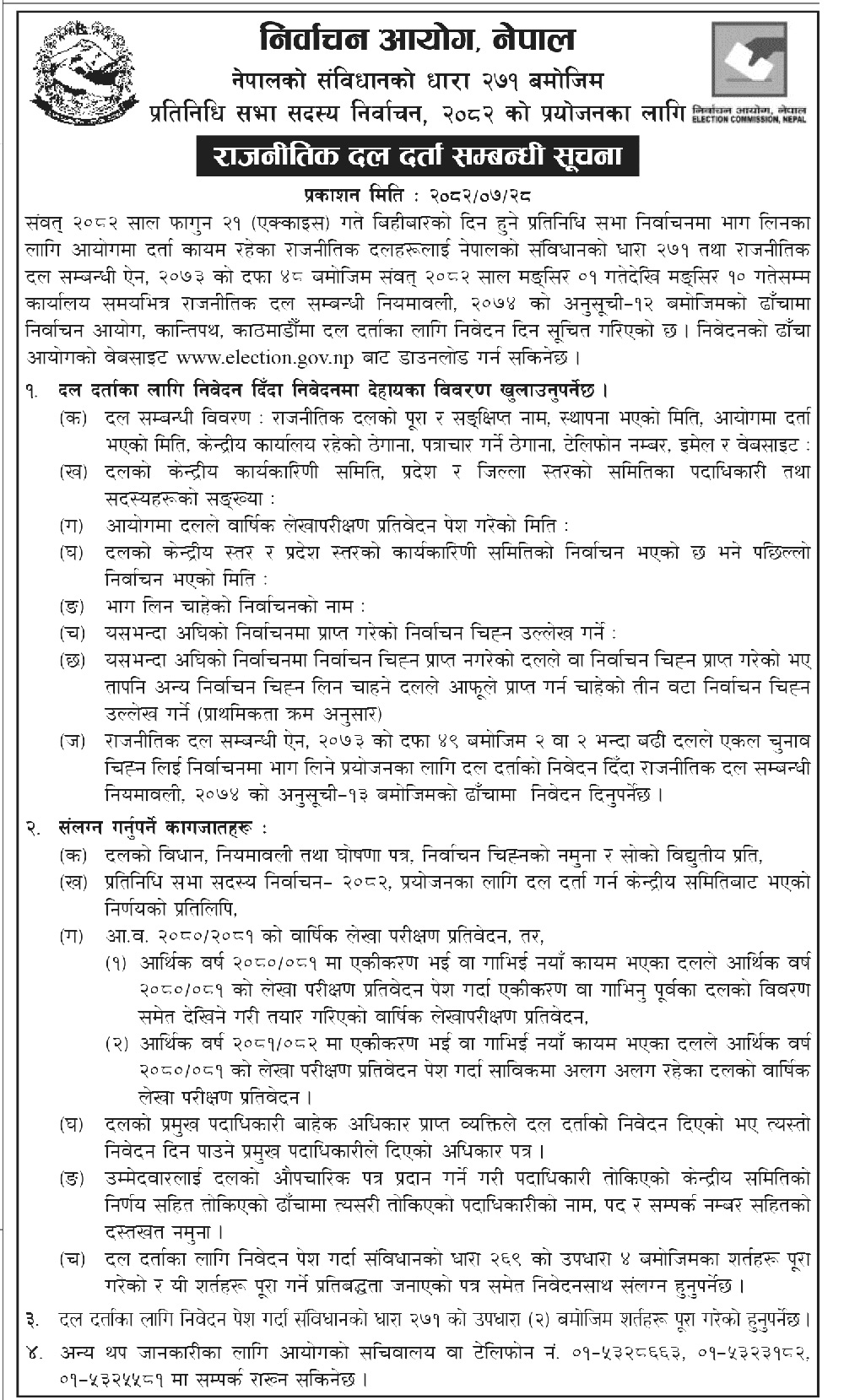आयोगले प्रतिनिधि सभा सदस्य निर्वाचनका लागि मङ्सिर १ देखि १० गतेसम्म र राष्ट्रिय सभाका लागि मङ्सिर १ देखि ७ गतेसम्म दल दर्ता गर्न आह्वान गरेको छ ।
