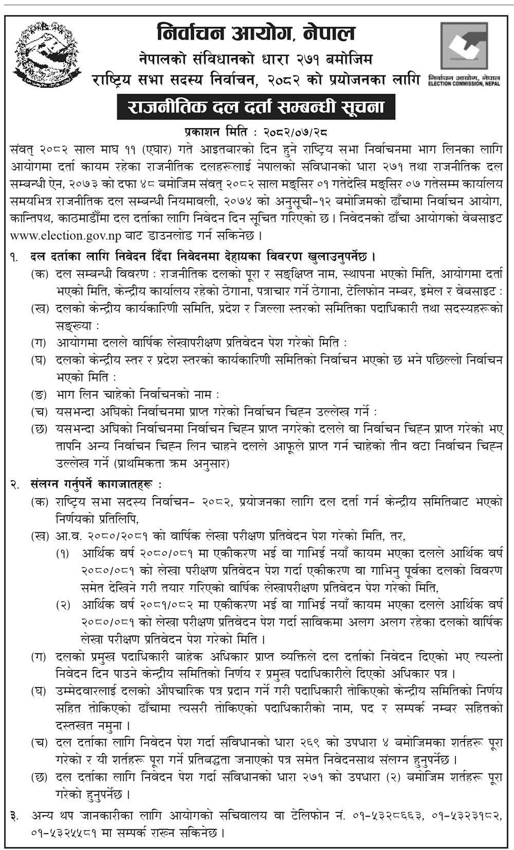 आयोगले दल दर्ताका लागि निवेदन दिँदा दलसम्बन्धी विवरण, दलको नाम आयोगमा दर्ता मिति लगायत आवश्यक कागजात समेत खुलाउन भनेको छ ।