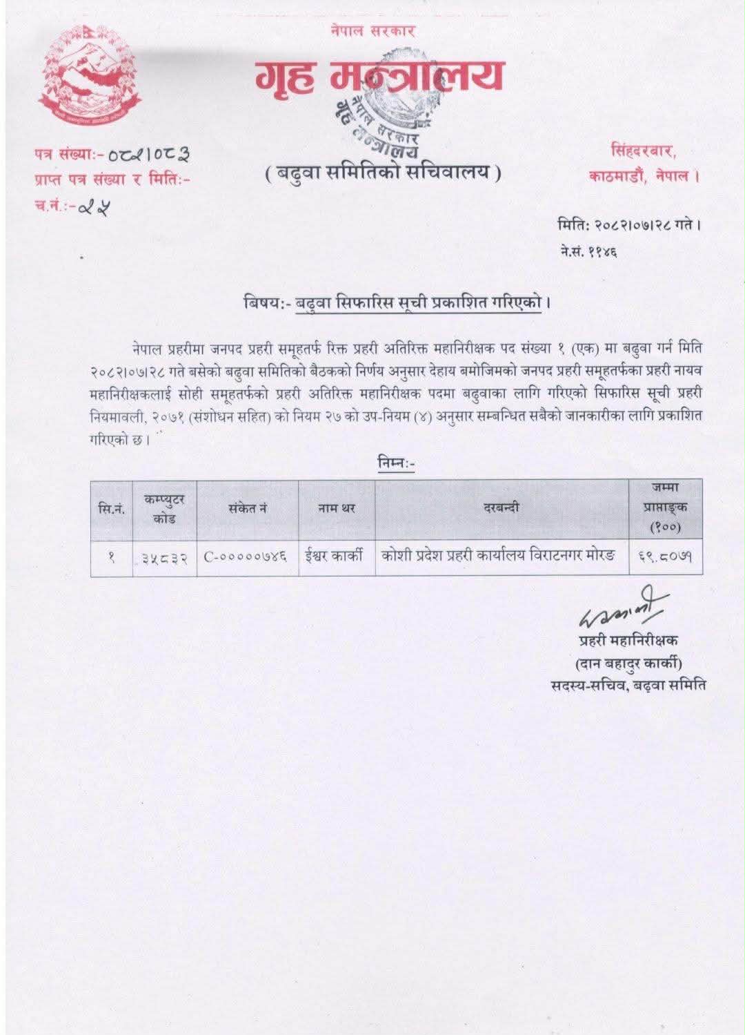बढुवा समितिको सचिवालयले २०८२ कात्तिक २८ गते बसेको बैठकको निर्णयअनुसार कार्कीलाई शुक्रबार प्रहरी अतिरिक्त महानिरीक्षक पदका लागि सिफारिस गरेको हो ।