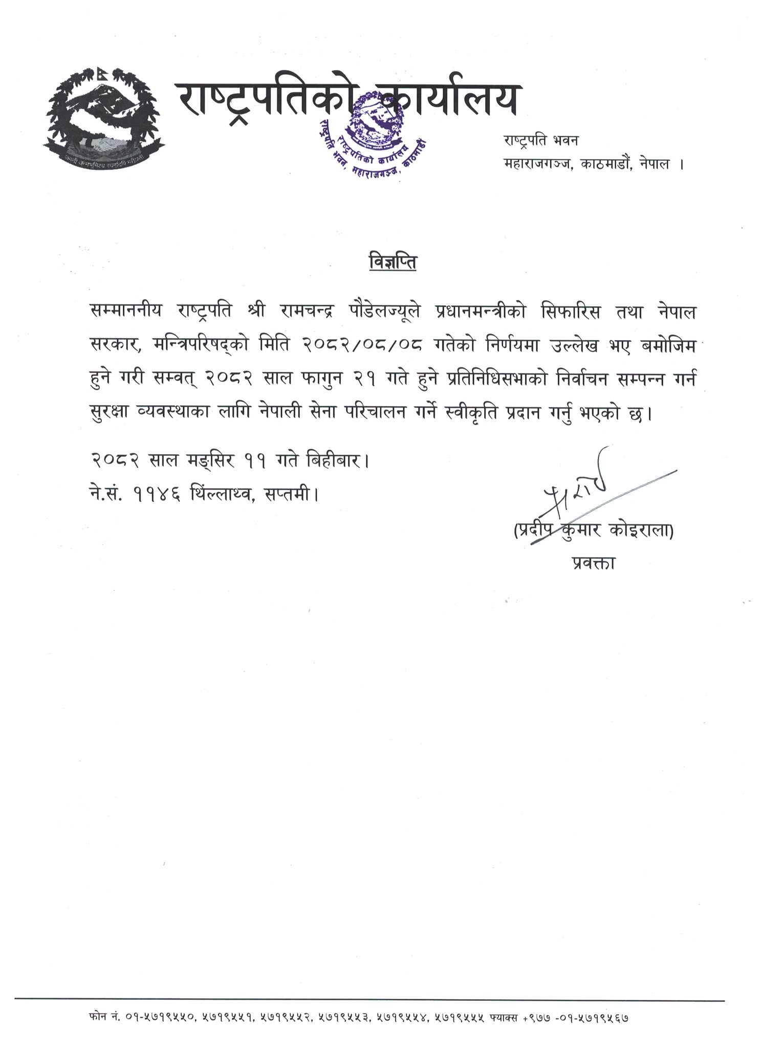 काठमाडौं । आगामी फागुन २१ गते हुने प्रतिनिधिसभा निर्वाचनमा सेना परिचालन गर्न राष्ट्रपति कार्यालयले स्वीकृति दिइएको छ ।