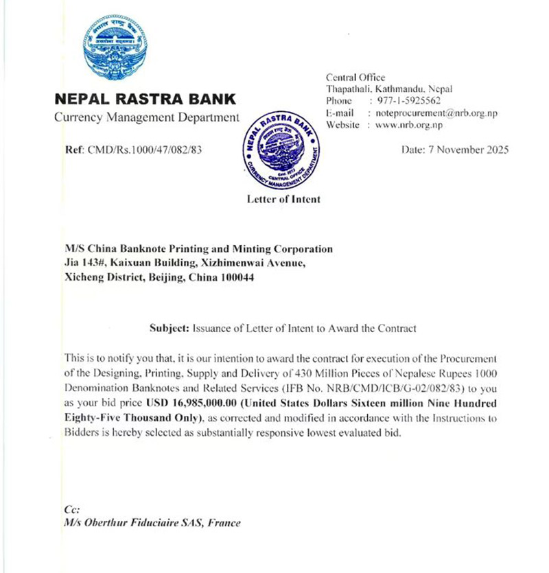 काठमाडौं । नेपाली नोट छाप्न चिनियाँ कम्पनी चाइना बैंक नोट प्रिन्टिङ एण्ड मिन्टिङ कर्पोरेसन बेइजिङले ठेक्का पाएको छ । ओबर्थर ट्रस्टी एसएएस, फ्रान्सको यो कम्पनीलाई उछिन्दै चाइना कम्पनीले ४ खर्ब ३० अर्ब बराबरको नोट छाप्ने ठेक्का पाएको हो । बोलपत्रमार्फत प्राप्त भएकोमध्ये सबैभन्दा थोरै मूल्य प्रश्ताव गरेकाले कर्पोरेसन बेइजिङलाई नेपाल बैंकले छनौट गरेको हो ।