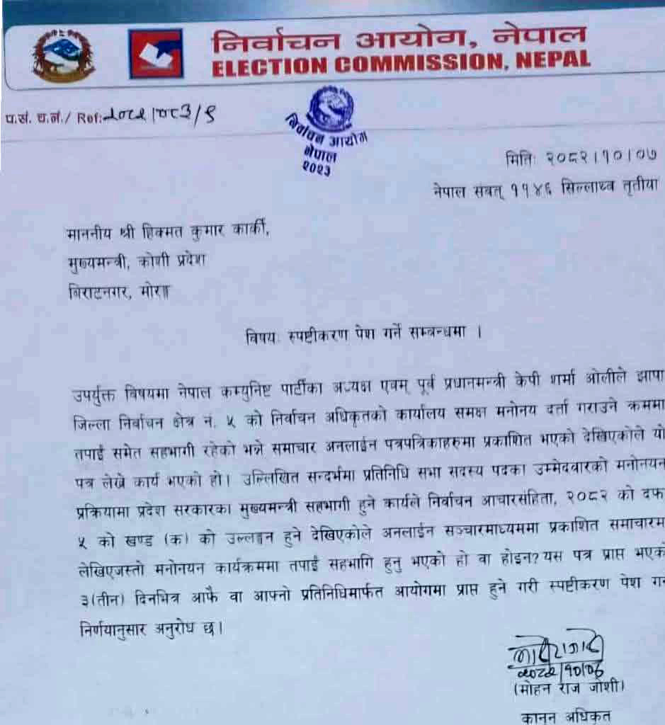 झापा निर्वाचन क्षेत्र नं ५ मा एमाले अध्यक्ष केपी शर्मा ओलीको मनोनयन दर्तामा सहभागी भएको आरोपमा आयोगले मुख्यमन्त्री कार्कीसँग ३ दिनभित्र लिखित जवाफ पेश गर्न निर्देशन दिएको हो।