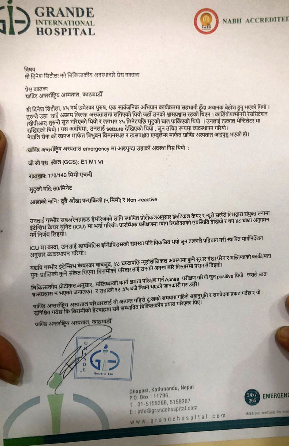 ‘चिकित्सकीय प्रोटोकलअनुसार, मस्तिष्कको कार्य क्षमता परिक्षण गर्न एप्निय परीक्षण गरियो जुन पोजिटिभ थियो। जसले स्वतः श्रासप्रश्वास नभएको जनाउँछ। र उहाँको १२:४५ बजे निधन भएको जानकारी गराउँछौं,’ विज्ञप्तिमा भनिएको छ।
