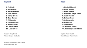 मुम्बईस्थित वानखेडे मैदानमा केहीबेरमै सुरु हुने खेलमा नेपालले पहिले फिल्डिङ गर्ने भएको छ । इंग्ल्यान्डका कप्तान ह्यारी ब्रुकले टस जितेर पहिले ब्याटिङ रोजेका हुन् ।