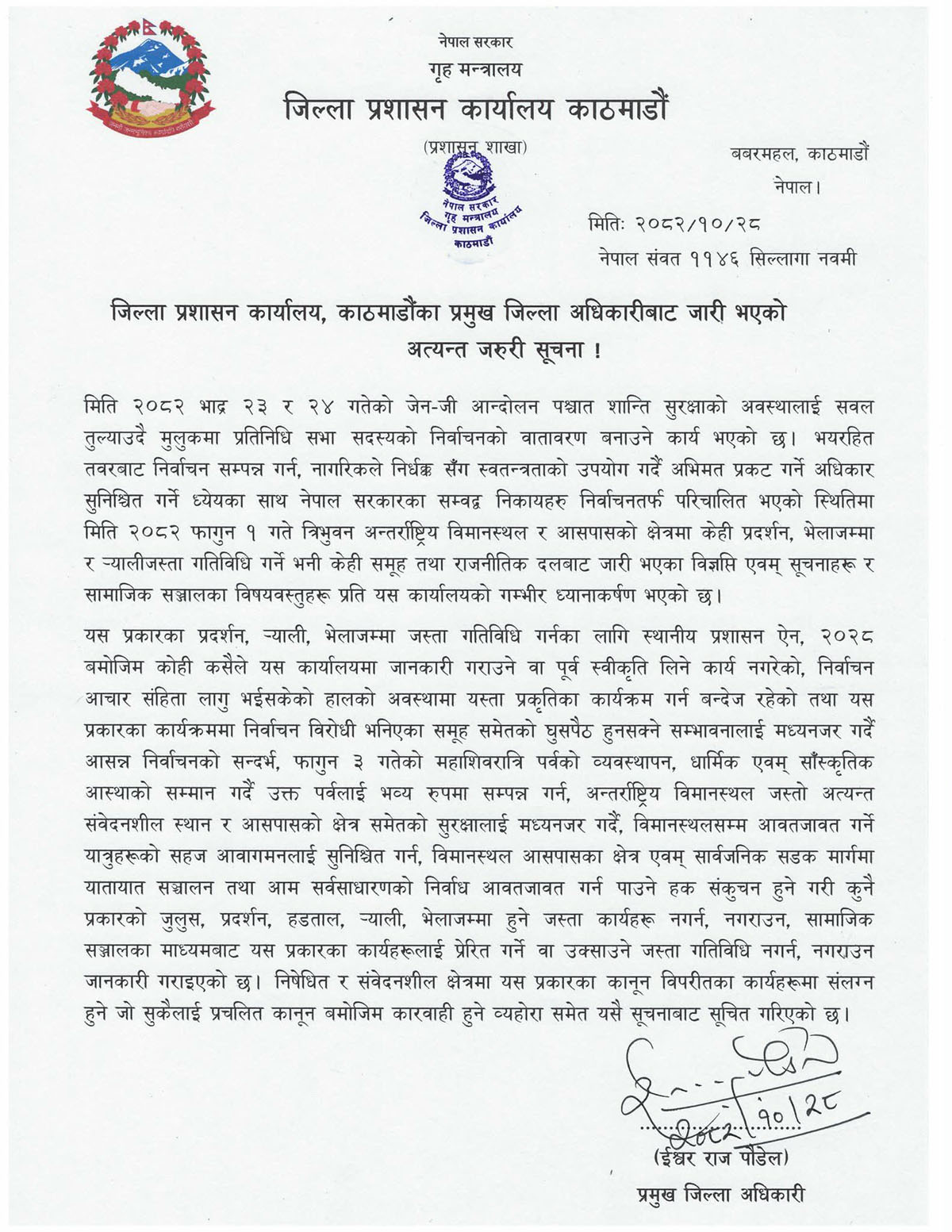 आज एक सूचना जारी गर्दै प्रमुख जिल्ला अधिकारी ईश्वरराज पौडेलले विमानस्थल र आसपासमा प्रदर्शन र र्यालीजस्ता गतिविधि गर्ने भनि सामामाजिक सञ्जालमा आएका विषयवस्तुहरुप्रति ध्यानाकर्षण भएको बताएका छन् । यसप्रकारका गतिविधि गर्नका लागि जिप्रकामा अहिलेसम्म कसैले पनि जानकारी नगराएको र पूर्वस्वीकृति नलिएको उनको भनाइ छ ।