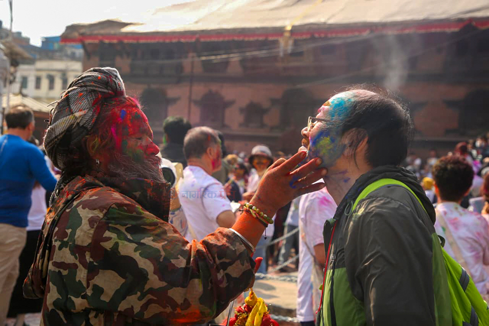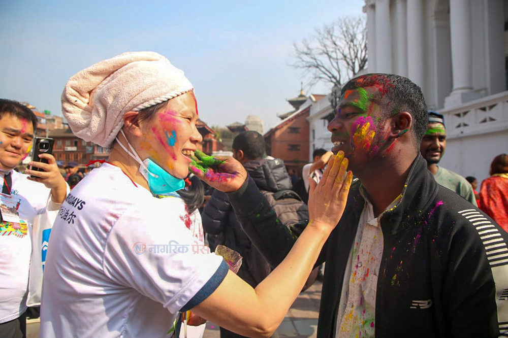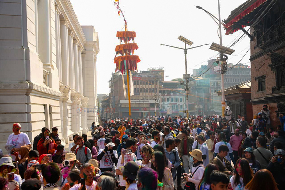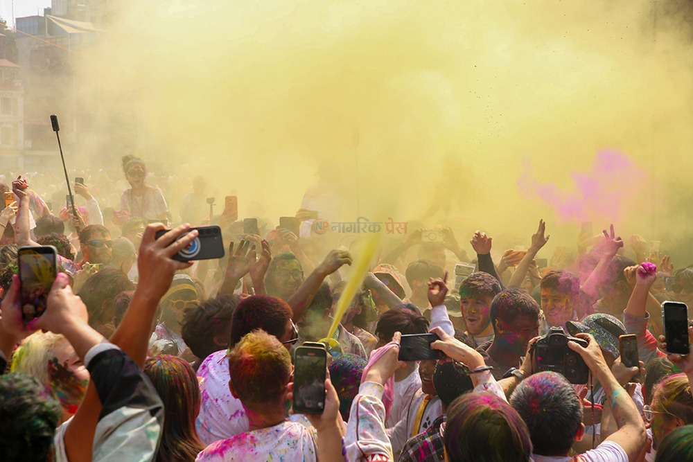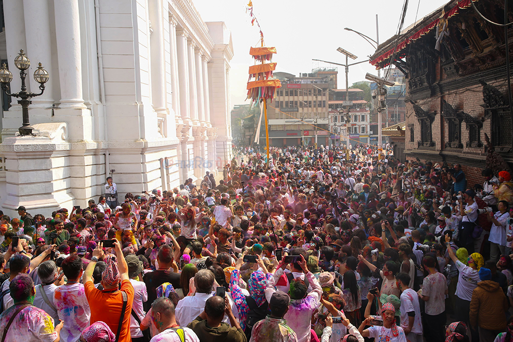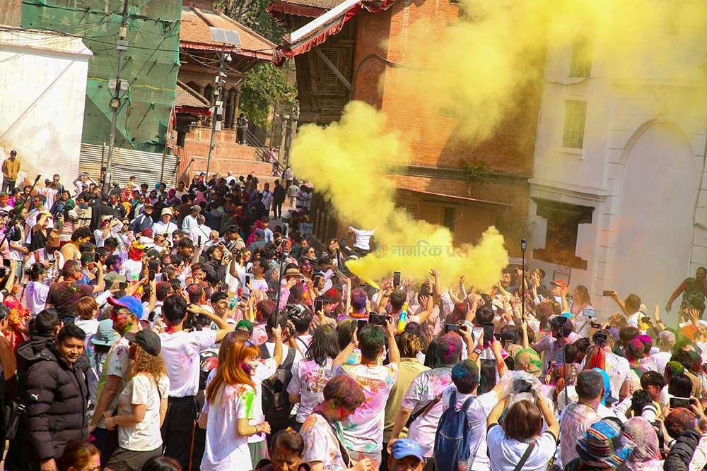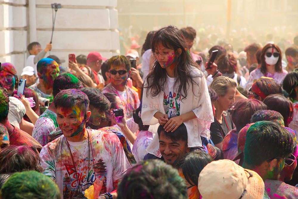 विगत वर्ष झैं वसन्तपुरमा होलीको हर्षोल्लास छाएको छ । विशेष गरी युवायुवतीले रौनक थपेका छन् । नेपाल घुम्न आएका विदेशी नागरिक पनि होलीको खुसीमा सँगसँगै रमेका छन् । भिडभाड, नाचगान र रङले वसन्तपुर रङिएको छ । काठमाडौंको वसन्तपुर, ठमेल लगायतका स्थानमा नेपाली मात्रै नभई विदेशी पर्यटकहरू पनि एक आपसमा रङ, अबिर लगाएर नाच गान गरेर होली मनाइरहेका छन् ।
