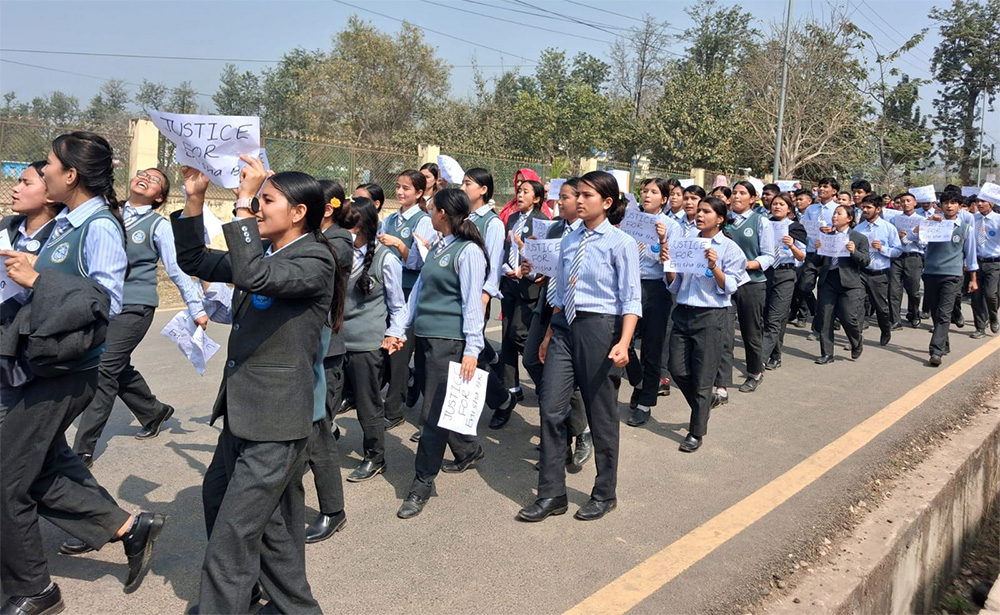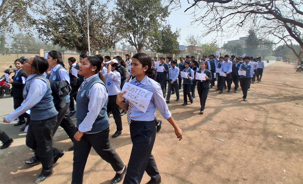 विद्यालय पोशाकमै रहेका उनीहरुले केही समय जिल्ला प्रहरी कार्यालयको गेटमा नाराबाजी समेत गरेका छन् । ‘इनिशालाई न्याय दे’, ‘हत्यारालाई फाँसी दे’ ‘छोरी मार्न पाइँदैन’ लगायतका नारा लेखिएका प्लेकार्डसहित उनीहरुले प्रदर्शन गरेका हुन् ।