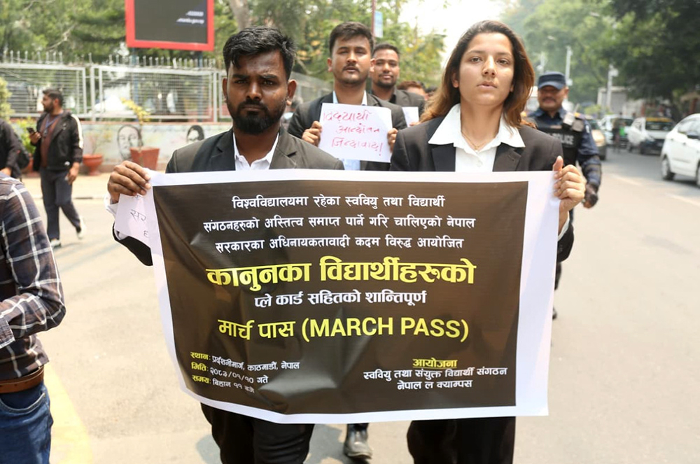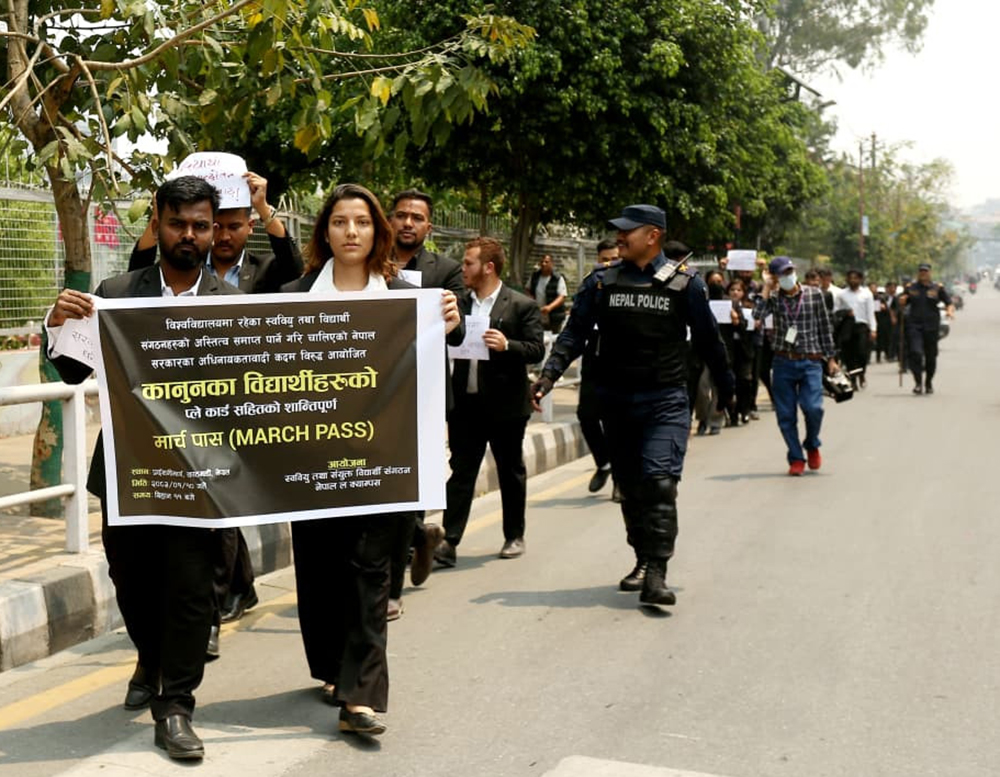 नेपाल ल क्याम्पस स्ववियु तथा संयुक्त विद्यार्थी संगठनको आयोजनामा आज विद्यार्थीले सरकारको अधिनायकवादी कदम विरुद्ध प्लेकार्डसहित शान्तिपूर्ण मार्चपास गरेका हुन् ।